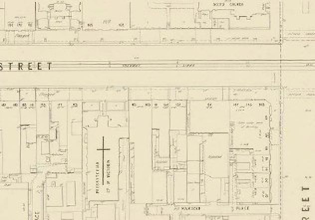An MMBW plan of Collins Street of 1895 showing the buildings on the south side of the street, west of Russell Street. The footprints of the buildings that occupied the future site of Kurrajong house (No’s 173 and 175) are to the west of St Enoch’s Presbyterian Church, which is marked with a cross (State Library of Victoria Map Collection).