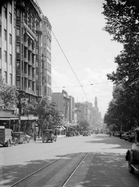 Early photographs and drawings of St Enoch’s show to its west a modest three-storey building occupying what was to become the site of Kurrajong House. This building housed an auctioneer and estate agent. Another occupant of this building was a Walter Rose, who was a surgeon and dentist. To its west was a smaller two-storey building that also occupied the site of Kurrajong House. The surgeon and dentist, John Iliffe, occupied this building. These buildings formed part of a larger group of commercial premises in this part of Collins Street that housed a variety of businesses including the offices of two of Melbourne’s daily newspapers The Herald and The Argus.