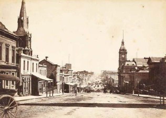 Collins Street looking west from the Russell Street corner in 1875. The spire of St Enoch’s is partially visible at left, and beyond the church are the buildings that formerly occupied the site of Kurrajong House (State Library of Victoria Picture Collection).